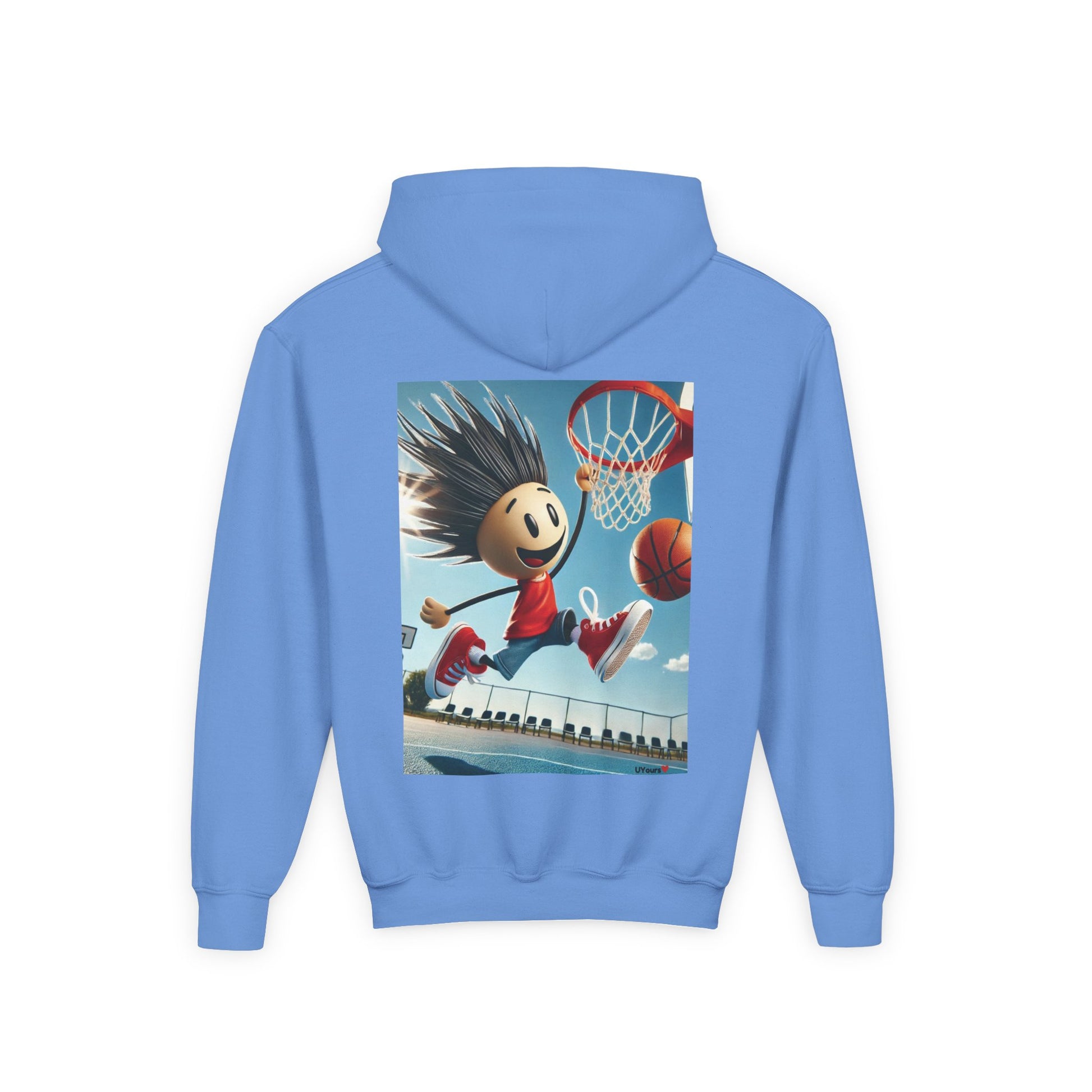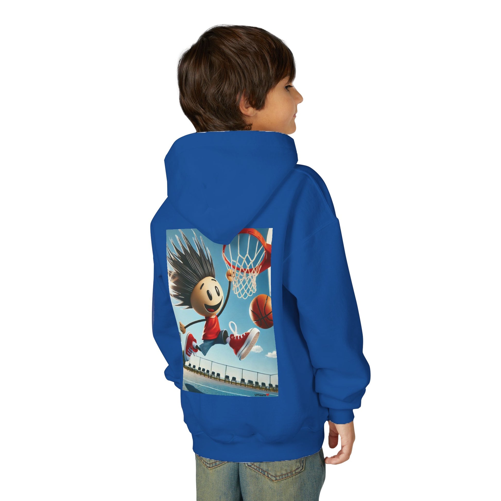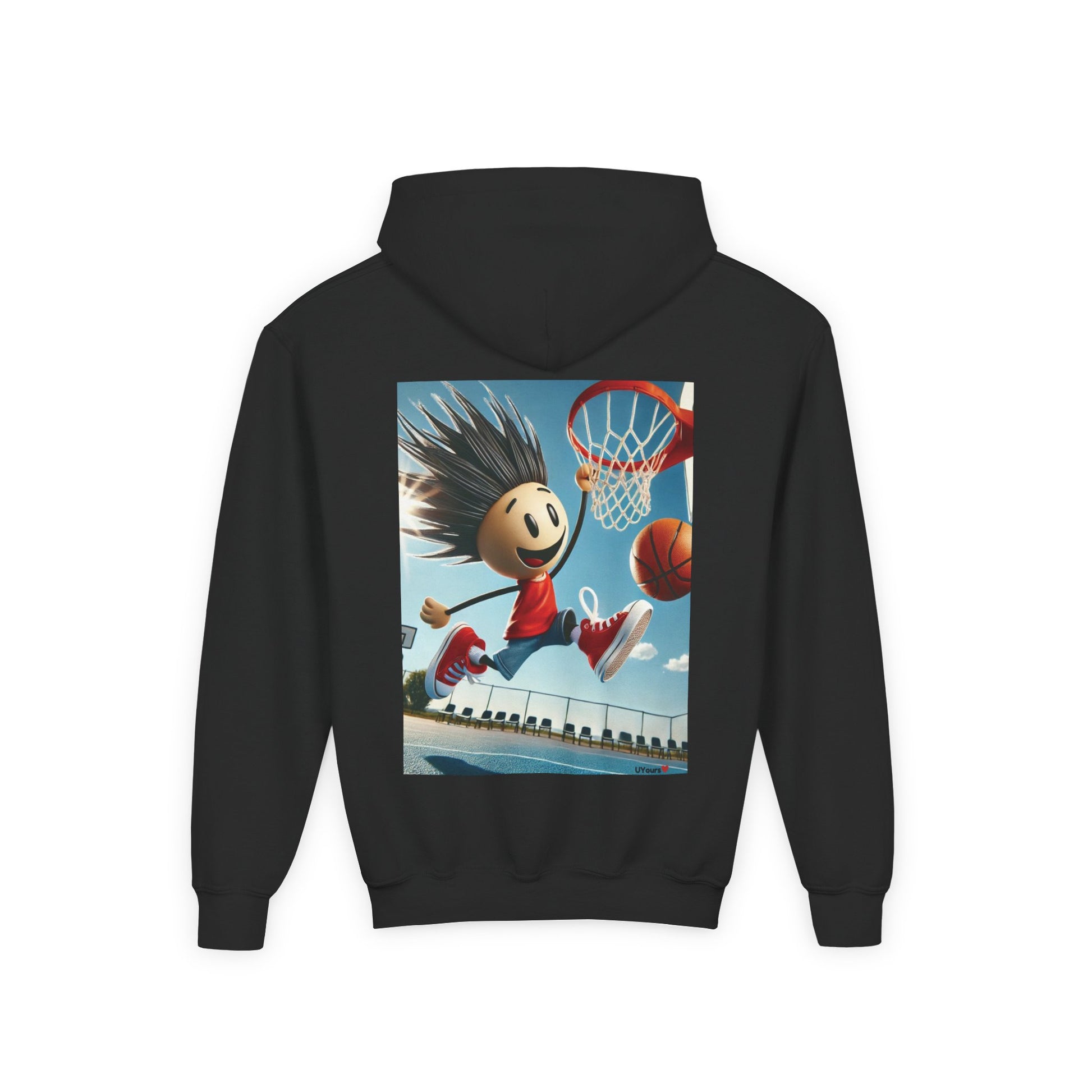 Elevate your style with the "Hoops Champion" Youth Heavy Blend Hooded Sweatshirt. It features a dynamic stick figure character soaring through the air, dunking a basketball with flair. Crafted from ultra-soft, preshrunk fleece, this hoodie offers exceptional comfort and durability. Made with a perfect blend of 50% cotton and 50% polyester, it minimizes lint buildup, ensuring long-lasting wear and an excellent surface for printing.